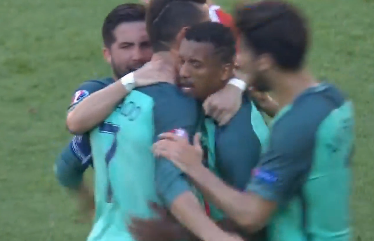 比赛进行到第42分钟,纳尼接C罗的快开任意球,禁区内不停球直接低射破门,将比分追平,