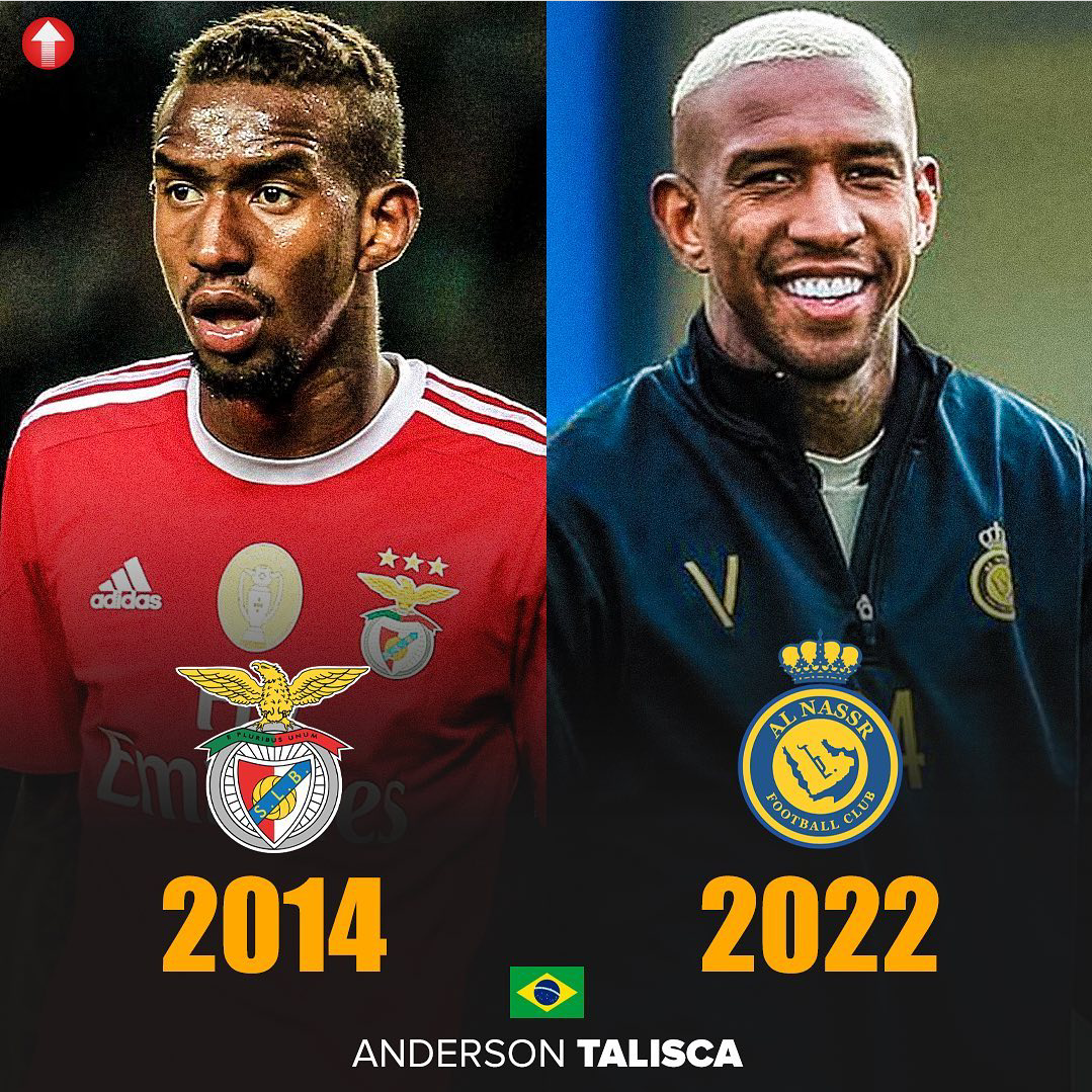 塔利斯卡 2014年本菲卡 → 2022年利雅得胜利中国球迷对塔利斯卡一定不会陌生,他曾在广州恒大效力三年,随队拿到过中超冠军,18赛季下半程18场16球4助攻更是威震国内足坛。出道于巴西球队巴伊亚的塔利斯卡从小就展现出了自己的足球天赋,13年跟随巴西U21赢得土伦杯冠军,转年以创巴伊亚队史纪录的转会费加盟本菲卡,在这里塔利斯卡迎来了职业生涯首个巅峰,助队赢得葡超冠军、葡联杯冠军和葡超杯冠军的同时,自己还获得了巴西国家队的征兆。但可能是因为贫民窟的悲惨出身使得塔利斯卡对薪资格外看重,无论是广州还是如今的利雅得胜利,塔利斯卡所得的报酬,都远高于在欧洲效力