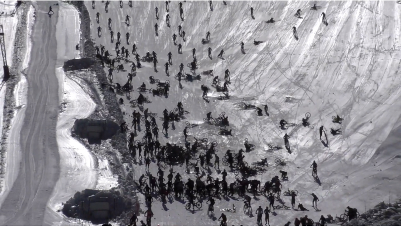 RT这样描述那一刻的情景:无助的骑手们相互撞在了一起,仿佛正在上演一场由散落满地的金属车和从陡峭冰川上冲下来的人碰撞而成的“狂欢”。