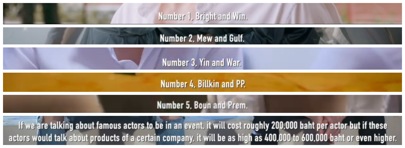 MewGulf和BrightWin收入的差别,我认为主要是经纪公司的差别。Mew有自己的工作室不久,Gulf的模特公司应该也不是大厂牌。而BrightWin是GMMTV力捧CP,市场资源分配肯定不是一个量级。MewGulf想要收入第一,还需努力。