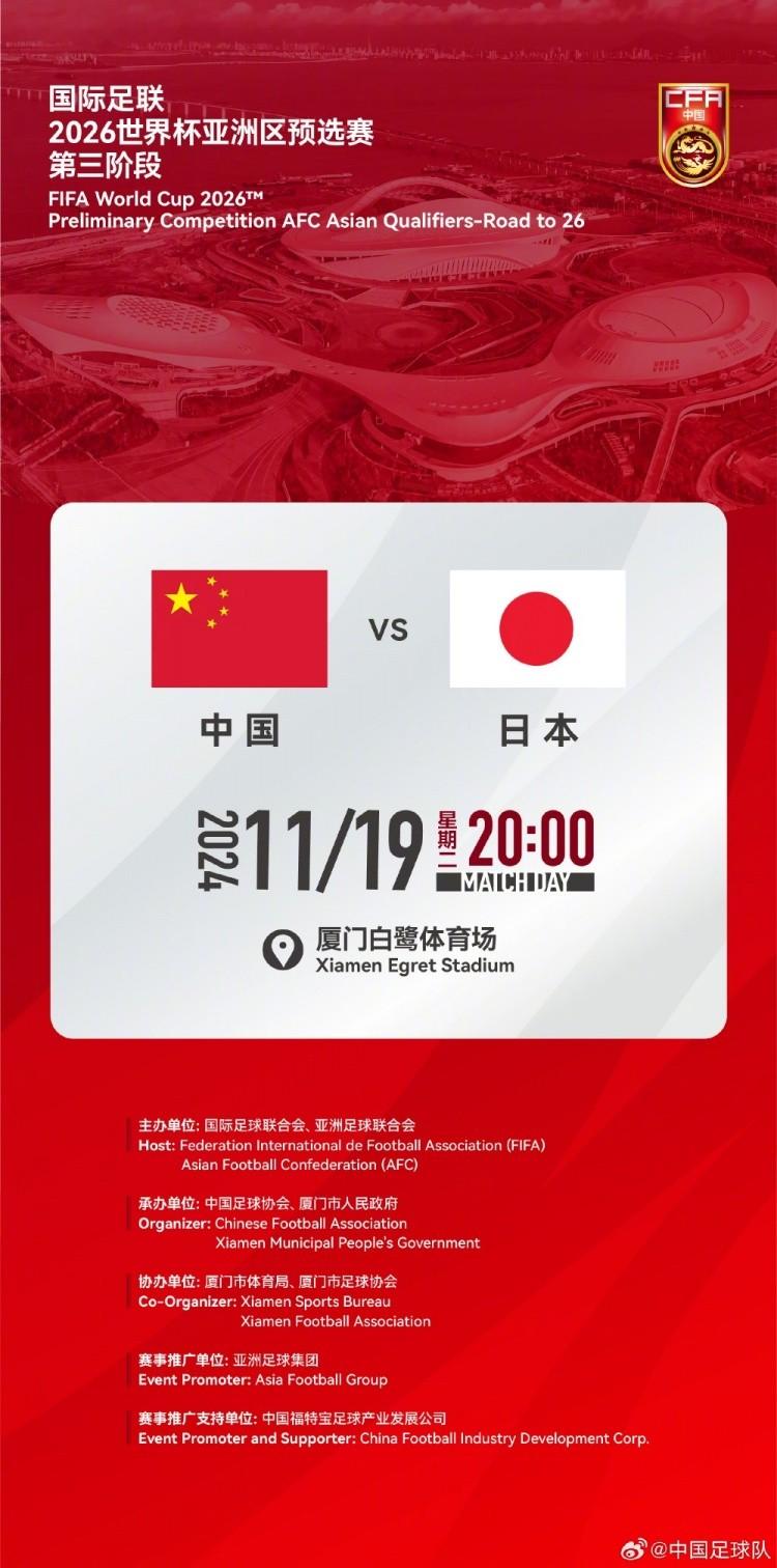 北京时间10月17日,中国足协官方确认,11月19日世预赛第三阶段国足主场对阵日本的开球时间为20:00。