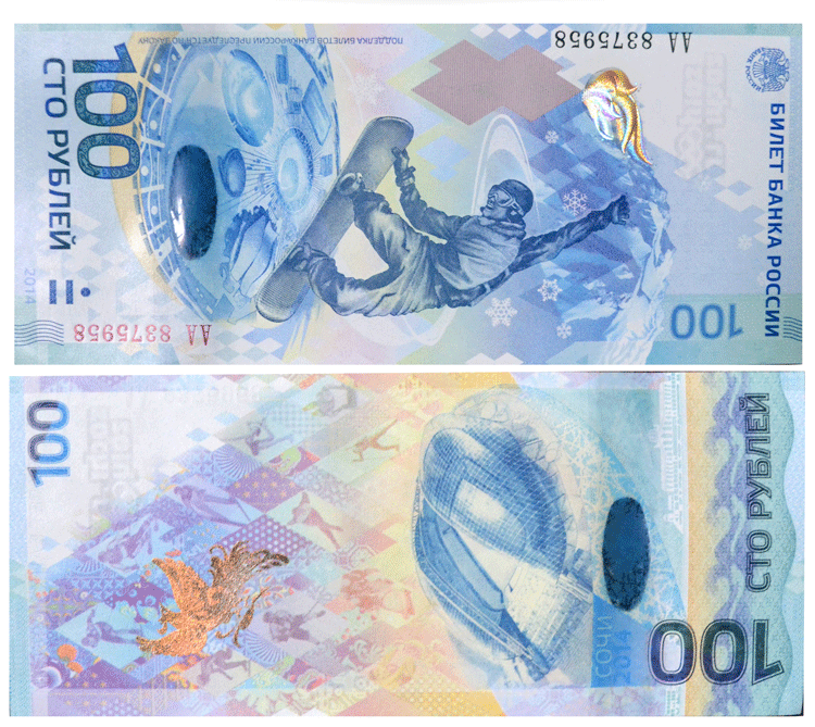 7.纪念钞。2014年索契冬季奥运会纪念钞以蓝色为主色调,纸币图案设计为竖版,纪念钞的正面为一名冬季滑雪板运动员腾空而起的造型,他的身后是巍峨的雪山;索契奥林匹克体育场、波尔肖冰宫等其他奥运场馆的俯瞰图;背面为索契冬奥会主会场——菲施特奥林匹克体育场及索契城市建筑和幻想的火鸟,这是俄罗斯发行的首枚奥运纪念钞。