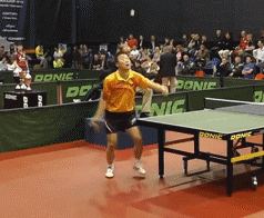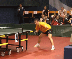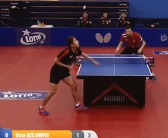 当完成上面步骤之后,对方回球就会以上旋球为主了,这时候也就是我们下杀板的机会,这时候对上旋球的抢攻一定要注意动作的转换,不要再去拿拉下旋球的动作进攻,回球失误率就增加了。这时候的进攻要多加撞击,包括引拍的方向更多是往后引拍,减小向下的幅度,这些都要有意识的提前准备。下面动图是吉田海伟,不能有一板过的心理,要注意进攻的连续性。