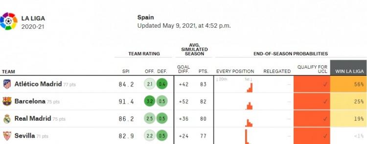 大数据网站fivethirtyeight预测,马竞夺冠概率达56%,巴萨25%,皇马19%。