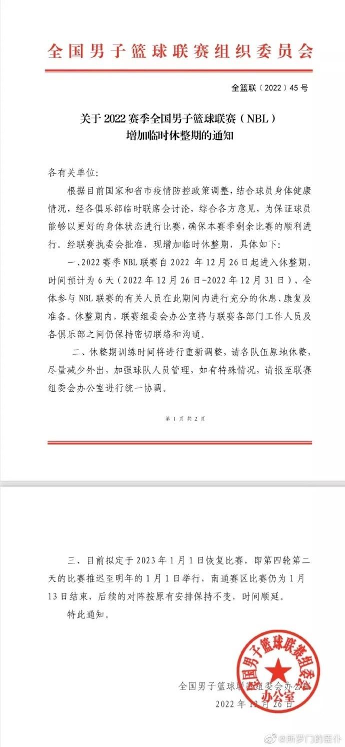 根据此前的报道,中国篮协主管的NBL赛事昨晚已经下发了联赛暂停通知,但没下发官方文件,各参赛俱乐部已收到相关通知。