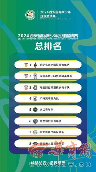 冠军组决赛后,由裁判长韩伟宣布了本届国际青少年足球邀请赛成绩总排名:哈萨克斯坦海拉提青年队排名第一,排在第二名的是深圳基地U14男足精英梯队,乌兹别克斯坦棉农青年队排在第三名,获得第四名至第八名的队伍依次是:广州英华思力青年队、浙江青年队、荷兰邓伯什青年队、西安市男子青年队、德国奥尔登堡青年队。