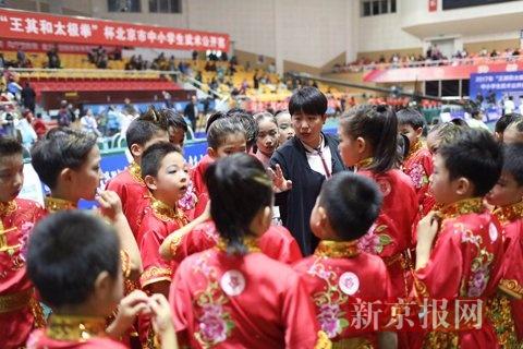 海淀区双榆树第一小学的武术教练高菲在赛前指导学生。