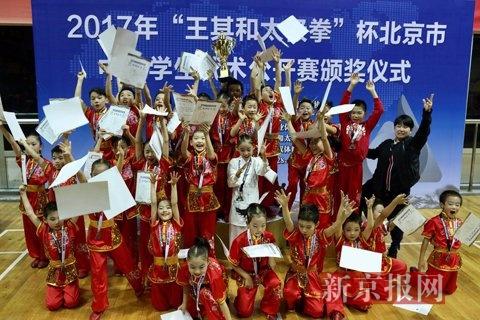 新京报快讯 10月28日,2017年北京市中小学生武术公开赛在地坛体育馆开幕,来自北京市166所中小学、武术学校的1200余名学生分为男女各四大组别,参加了拳术、器械、初级套路三大类24个单项的武术比赛。海淀区双榆树第一小学31名参赛学生最终夺得29个个人冠军并荣获团体冠军和最佳教练奖项。