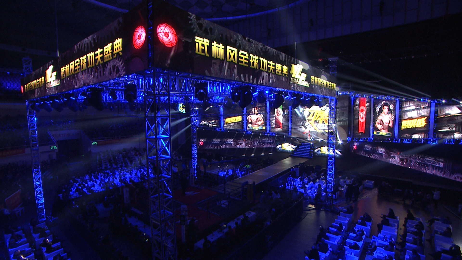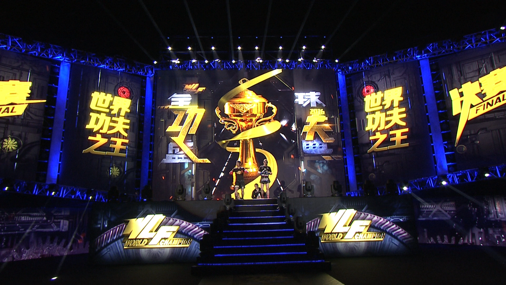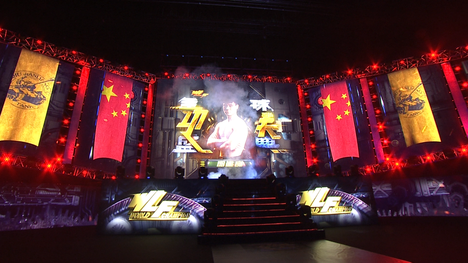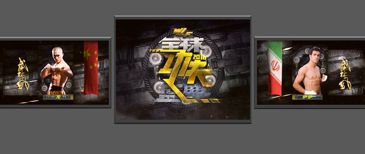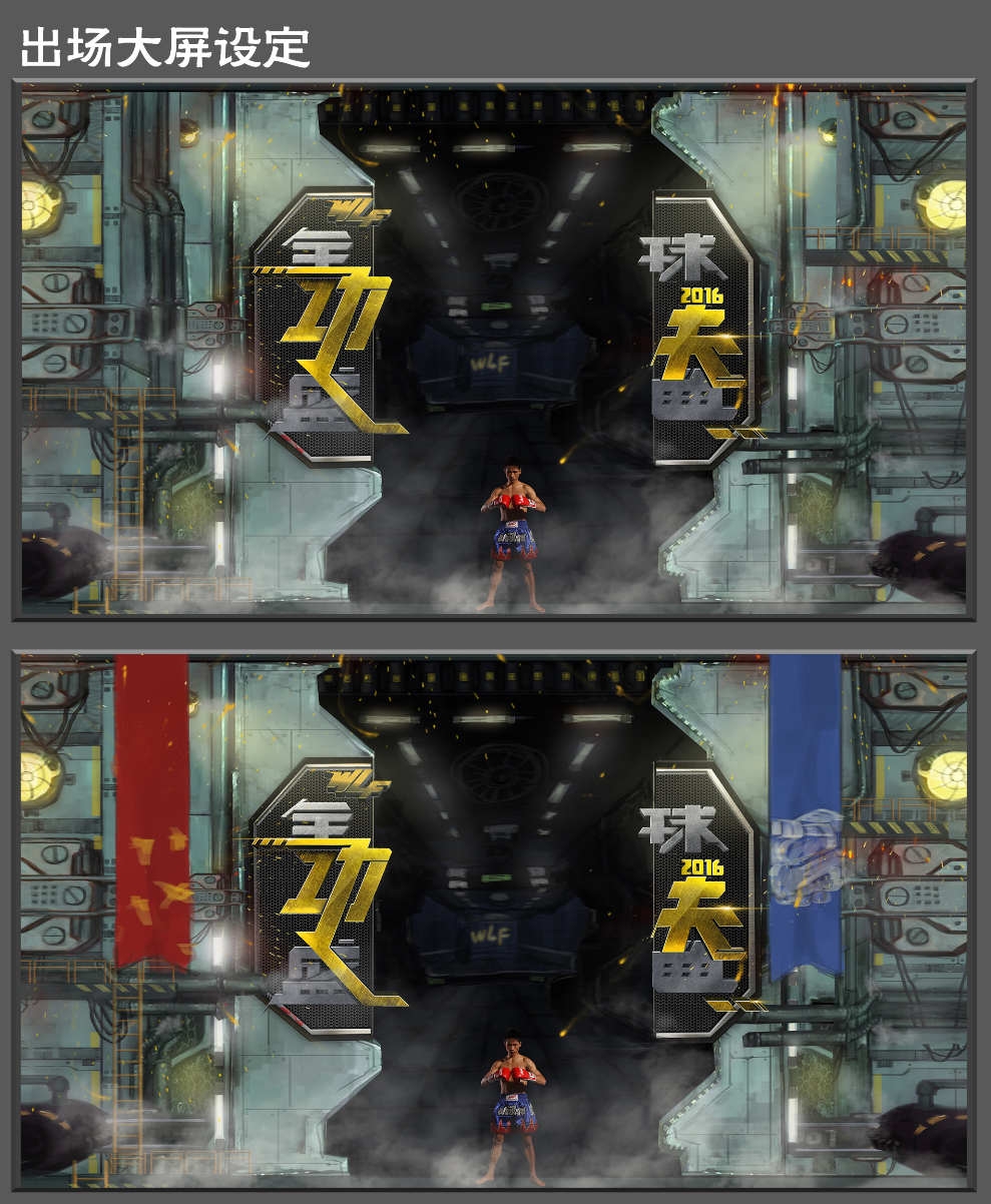 除了logo及海报设计,色普团队还承担了现场所有的大屏设计制作。2016年WLF全球功夫盛典在上海举办,一个国际化大都市集结了来时全世界顶尖的优秀搏击明星,怎么让每一位选手在出场时能感受到强烈的仪式感和荣耀感,是我们考虑的首要问题。