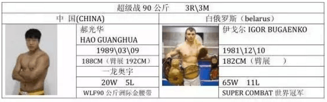 本次比赛最重量级的对决,郝光华迎战ACB队长伊戈尔。郝光华,绰号“怒火将军”,来自一龙奥宇俱乐部,散打名将, 风格顽强凶猛,擅长拳法进攻。2016年,郝光华曾经在武林风北京站击败马鲁万·博纳比(法国);武林风中荷对抗赛击败塞尔吉奥·皮克(荷兰);武林风深圳站,郝光华击败来自葡萄牙的WKU欧洲冠军约翰·查帕斯;武林风南京站击败新西兰冠军布兰登·路帕提,获得WLF92KG洲际金腰带。