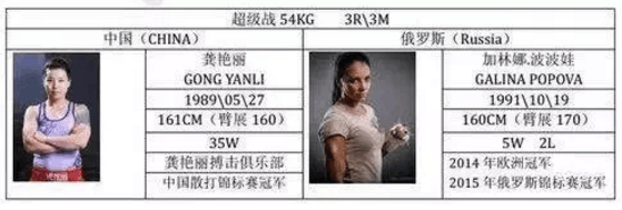 加纳林·波波娃,是典型的俄罗斯风格美女,俄罗斯锦标赛冠军、欧洲冠军,实力强悍,这不是龚艳丽首次对阵俄罗斯美女选手了,之前龚艳丽曾两次战胜世界泰拳冠军阿纳兹·塔西亚(第一次比分完胜,第二次直接三次读秒TKO),加纳林·波波娃能否打破龚艳丽的恐怖战绩,颇具悬念。