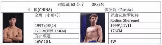 金鹰的对手是罗迪安·谢罗梅特,在武林风首次走进俄罗斯的比赛中,罗迪安·谢罗梅特战胜了中国勇士王珊伟,罗迪安的拳腿杀伤力强,擅长组合进攻,并且配合飞膝,秉承俄罗斯选手刚猛的风格,罗迪安期待对中国选手的两连胜。