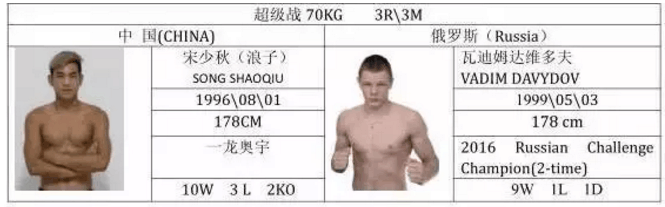 宋少秋的对手是俄罗斯的瓦迪姆·达维多夫,虽说只有18岁,但是战绩不俗,9胜1负1平,被誉为“俄罗斯金童”,在武林风莫斯科站击败了一龙奥宇的张忍,这次宋少秋对阵瓦迪姆,算是为同门师兄弟复仇吧,期待宋少秋的精彩表现。