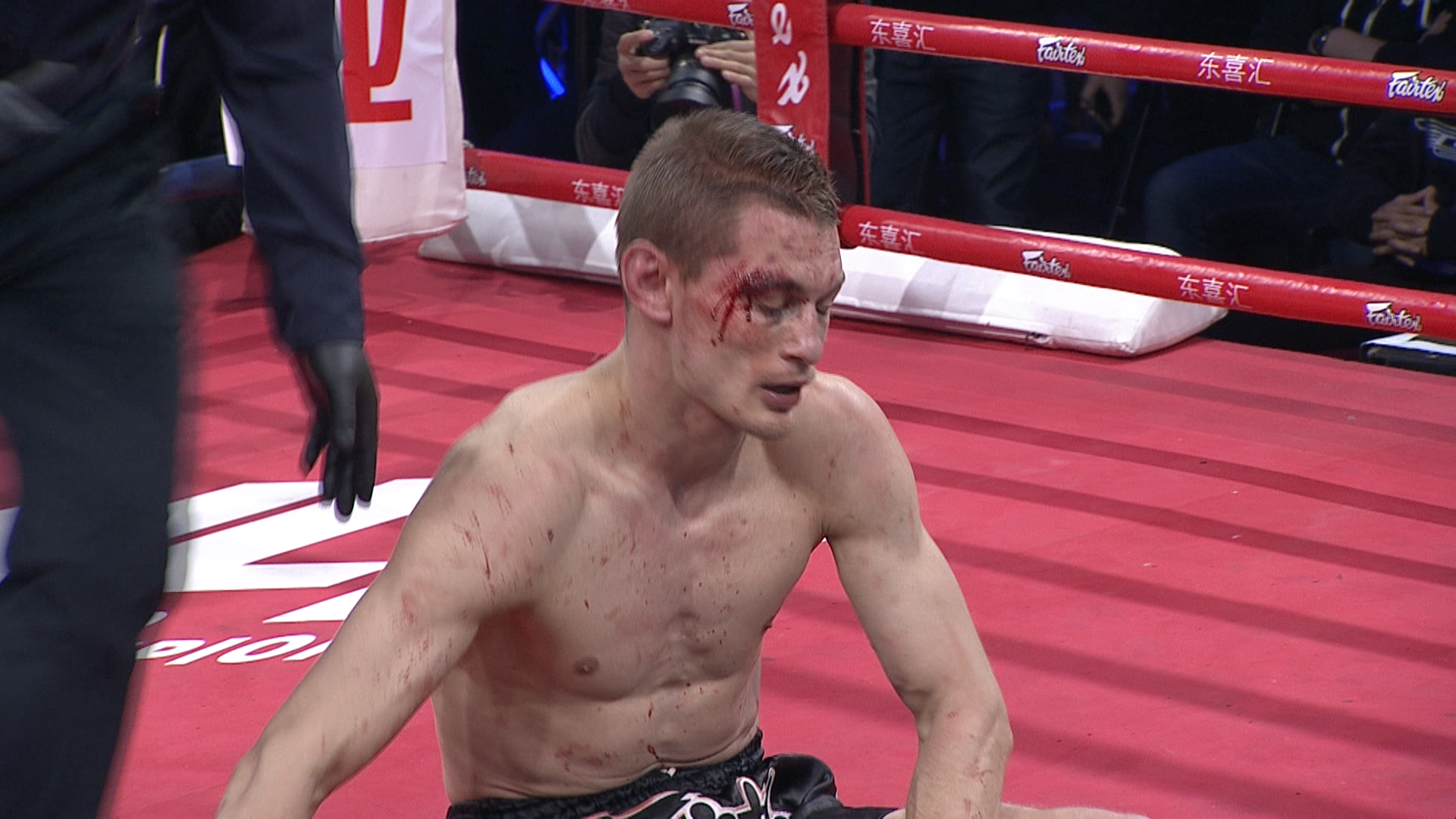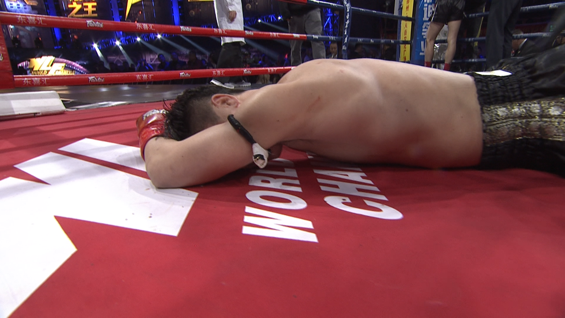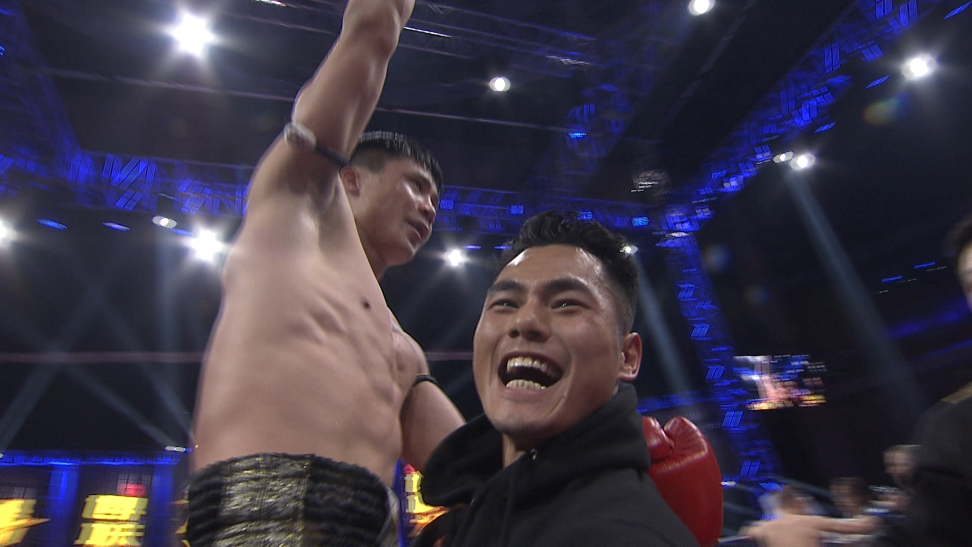 邱建良和古拉宾的决战出场,邱建良的两颗门牙被打断,古拉宾眉骨开裂,两人身上都伤痕累累,能站在决赛的擂台上,就是王者!