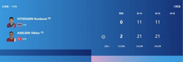 第二局,安赛龙占得先机开局5-1领先,昆拉武特抢攻拿到2分,但安赛龙保持着十足的耐心,牢牢占据场上主动,在多拍较量中连得3分以11-3进入暂停;暂停过后安赛龙攻防两端无懈可击,昆拉武特苦苦支撑。最终,安赛龙21-11再胜昆拉武特,总比分2-0轻取对手,成功卫冕奥运会男单冠军。