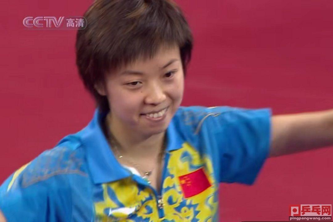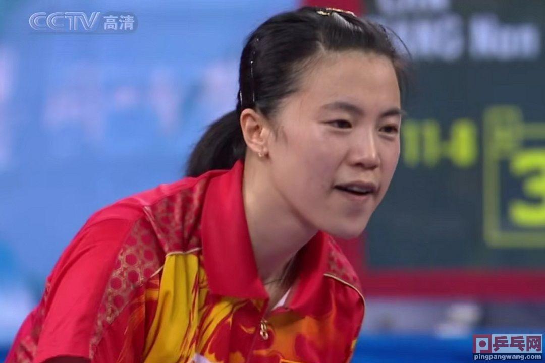 张怡宁发球,王楠连续三板反手弹击张怡宁正手,10-8拿到局点。