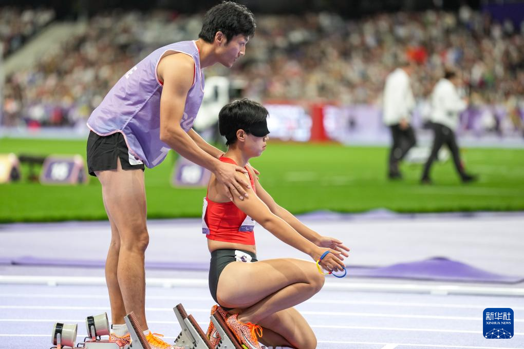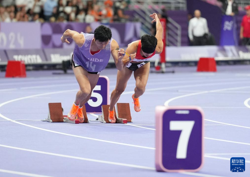 9月6日,中国队第一棒选手周国华(右)与领跑员贾登璞在比赛中起跑。
