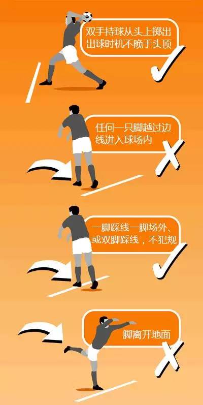 掷球时双臂要将球举过头顶,且双脚不能开地面。这是足球规则中明确的规定,如果违反就会被裁判判为违例,改由对方掷界外球。