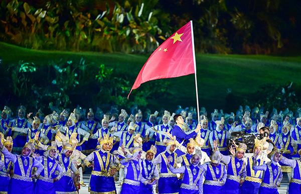 2018年雅加达亚运会开幕式,旗手赵帅引领中国代表团入场。东方IC 图