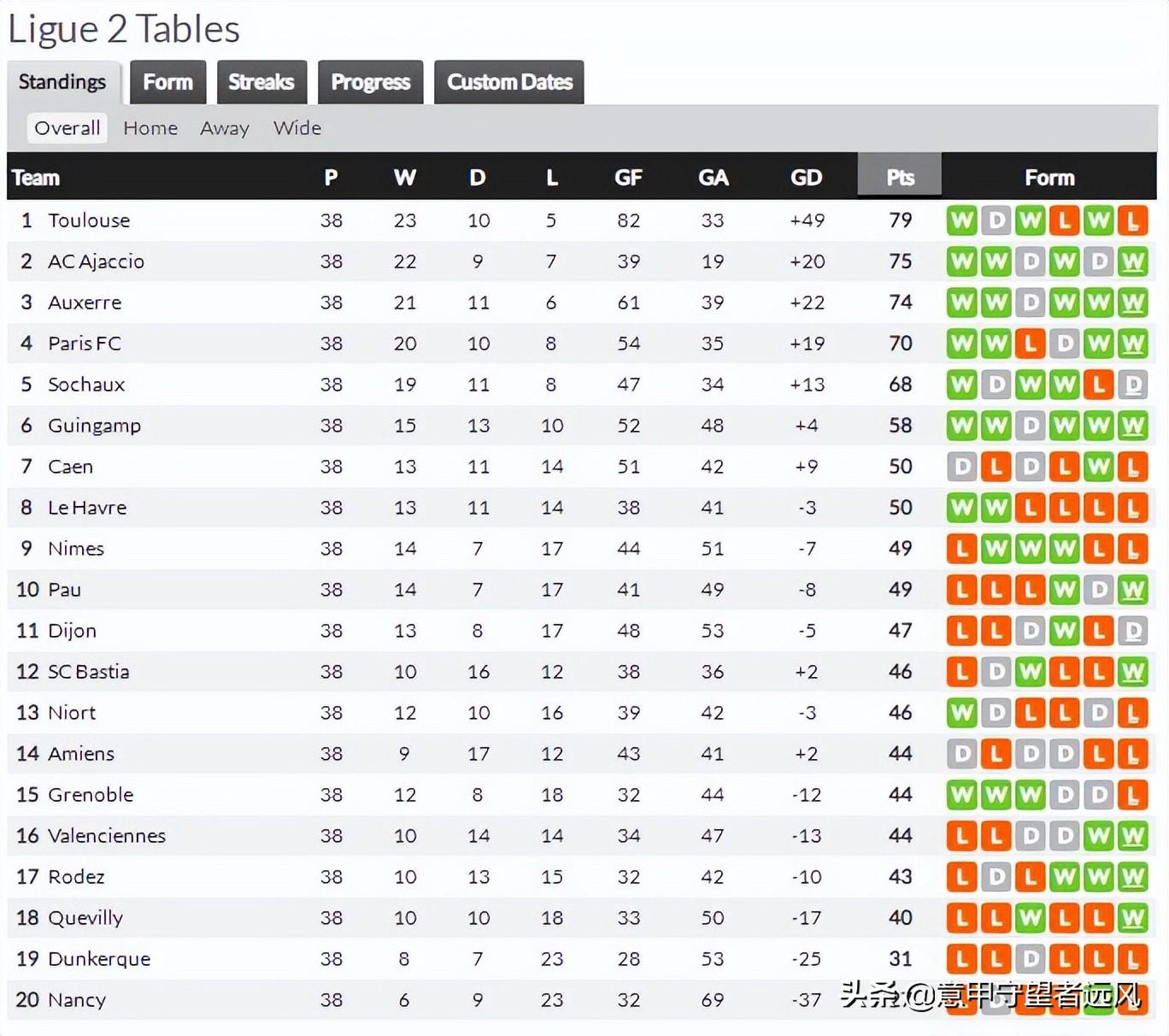 1.图卢兹79分,2.阿雅克肖75分,3.欧塞尔74分,4.巴黎FC70分,5.索肖68分,6.甘冈58分,7.卡昂50分,8.勒阿弗尔50分,9.尼姆49分,10.波城49分,11.第戎47分,12.巴蒂斯亚46分,13.尼奥尔46分,14.亚眠44分,15.格勒诺布尔44分,16.瓦朗谢纳44分,17.罗德兹43分,18.奎维利-鲁昂40分,19.敦刻尔克31分,20.南锡27分