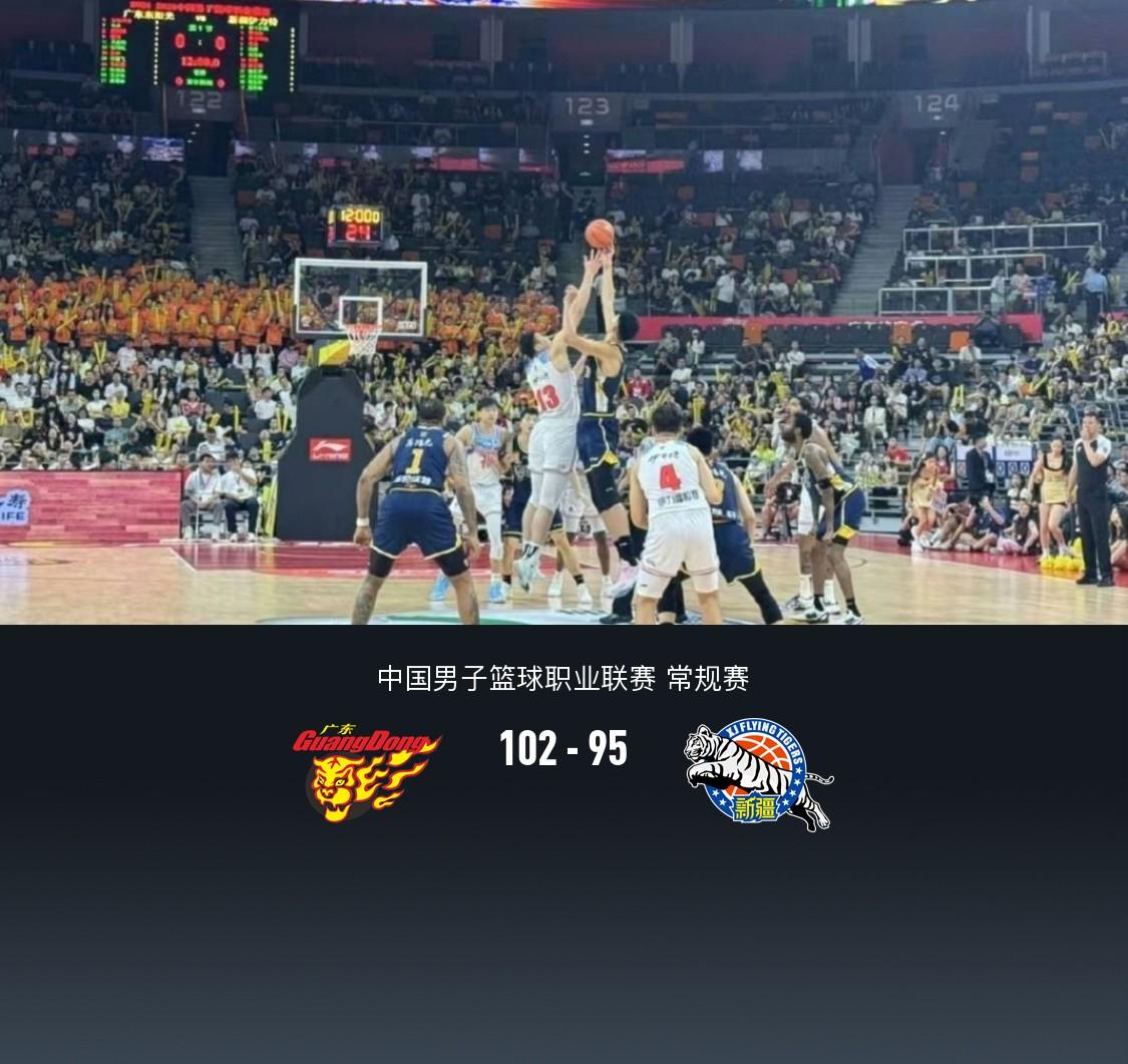 第四节,广东任骏飞站出来带队反扑迫近比分,随后吉伦沃特连站出来得分完成反超,新疆再度反超,随后双方拉锯紧咬比分,关键时刻广东徐杰、胡明轩联手帮助球队领先,随着杜润旺再中三分领先7分,新疆反扑无果,全场结束,广东102-95新疆。