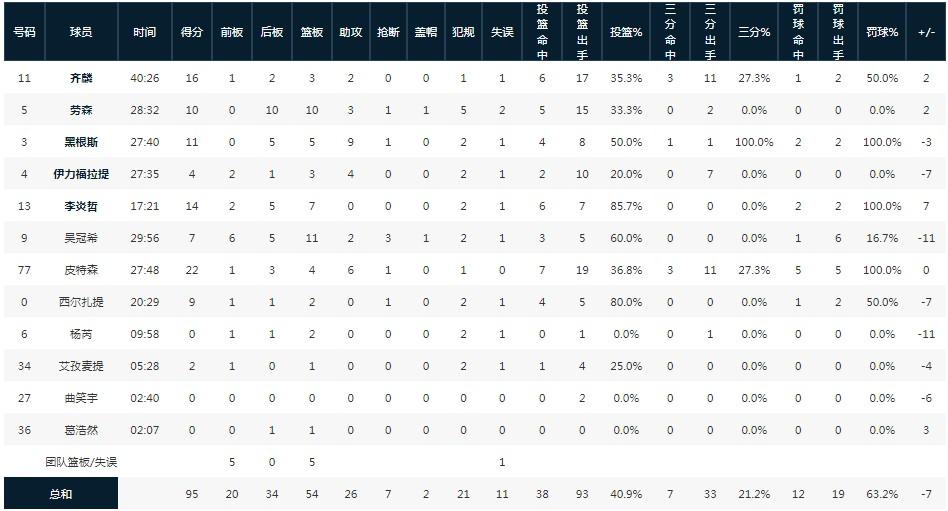 新疆伊力特昆汀-皮特森22分4板6助1断,齐麟16分3板2助,李炎哲14分7板。