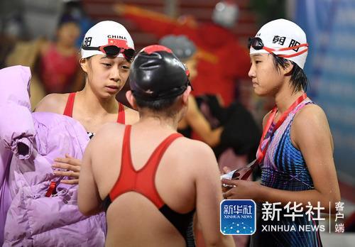 ↑12月12日,参加小学女子甲组100米自由泳决赛的选手们在赛后进行交流。