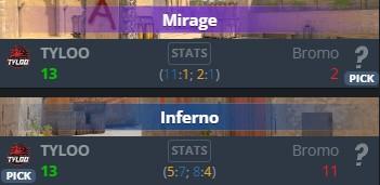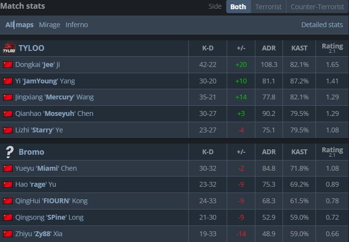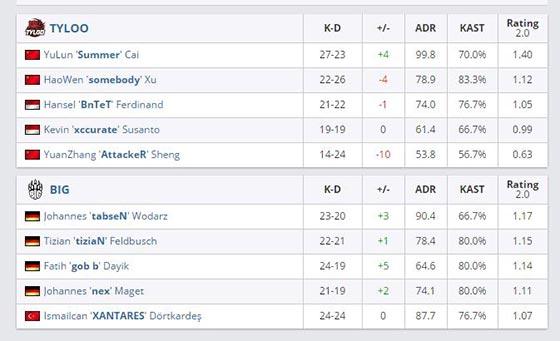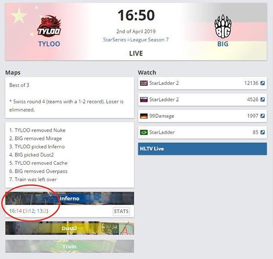 双方第一张比赛地图是Tyloo选择的de-inferno,开场后Tyloo作为进攻方靠着Somebody的灵性转点偷包先下一城,然而第二局就被BIG强起翻盘。此后Tyloo在进攻方遇到对手的全面压制,不论爆弹一波还是默认慢打均被BIG一一化解。比分的落后也让Tyloo几次出现进攻脱节的急躁现象,最终上半场Tyloo仅仅拿到3分,3-12落后。