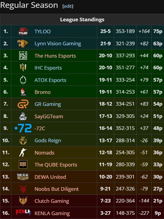 ECL-S48亚太区常规赛积分榜(前十名晋级季后赛)