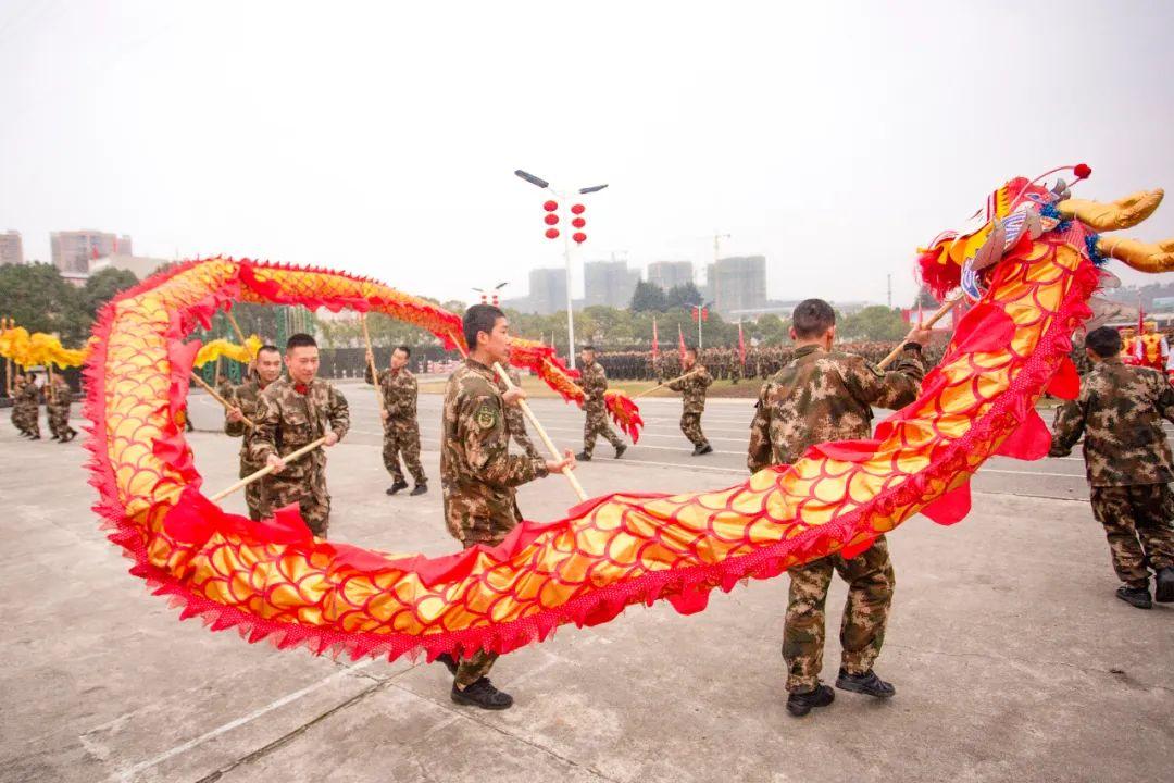 “舞长龙、砺虎气”。四条巨龙已齐聚到官兵中央,长长的巨龙时而腾起、时而伏地、时而翻滚、时而跳跃,被官兵舞得虎虎生风,在场观众也拍手称赞,连连叫好。