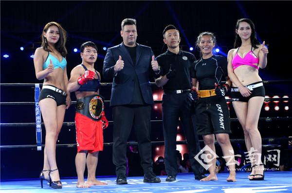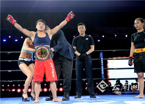 云南网讯(记者 黄翘楚 实习生 夏方海)12月21日晚,第六届CKF搏击联赛(昆明赛区)继续进行,在56公斤女子洲际金腰带争夺战中,文山铁姑娘严启慧仅用1分20秒就KO马来西亚对手泰迪安娜,拿到洲际金腰带。