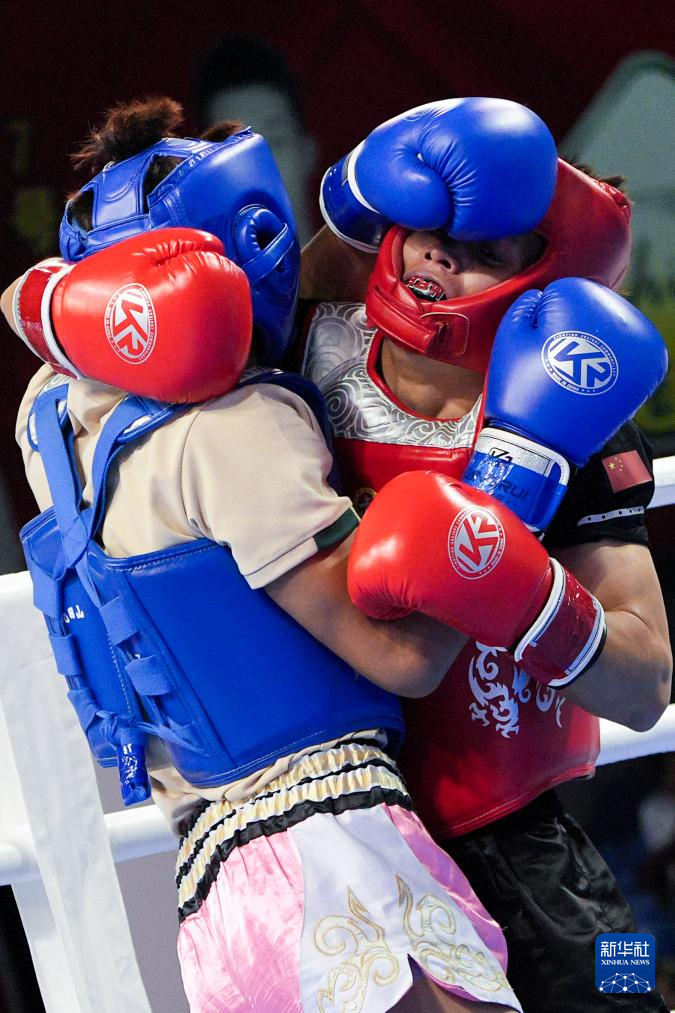 8月22日,陕西青奥队选手王玉辉(左)与贵阳博克斯队选手刘庭坤在男子K1组57公斤级比赛中。新华社记者 许畅 摄