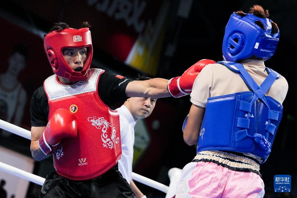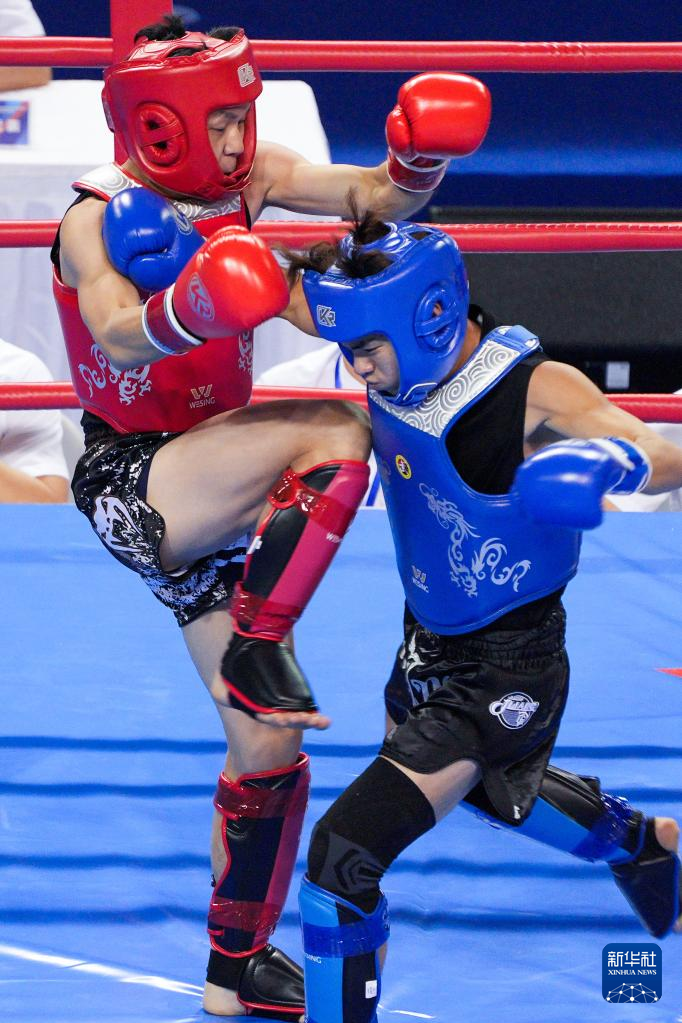 8月22日,中圆搏击队选手徐洲(左)与深圳龙岗队选手牛昌稳在男子K1组57公斤级比赛中。新华社记者 许畅 摄
