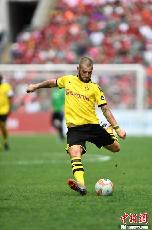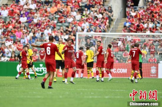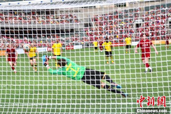 6月8日,利物浦传奇队与多蒙特传奇队于香港大球场举行足球慈善赛,利物浦传奇队球员科拿、杜迪克、韦斯达维特等球员与多蒙特传奇队球员迪基尔、轩列治、维丹费拿等球员双方进行精彩的足球对决,最终利物浦传奇队以3-2的比分胜出慈善赛。(中新社记者 李志华 摄)