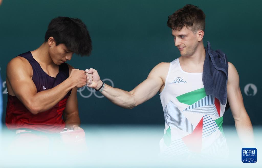 8月8日,中国选手伍鹏(左)与意大利选手祖尔洛尼在四分之一决赛前。最终,伍鹏获胜,晋级半决赛。新华社记者 高静 摄