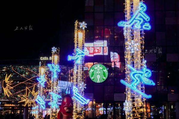 ↑1月10日,北京三里屯,夜幕降临,各类冬奥项目的彩灯亮了起来。