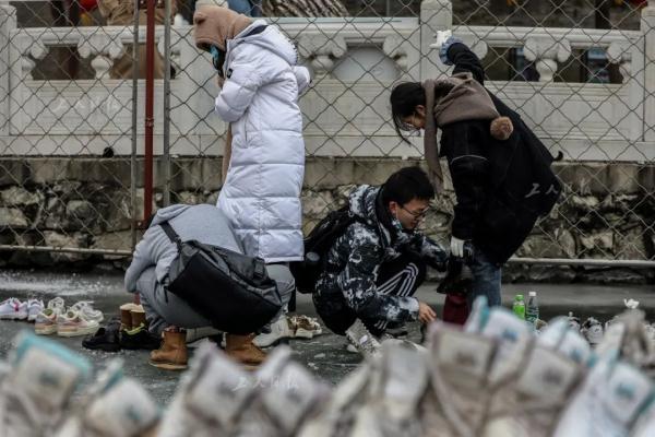 ↑1月9日,北京北海公园冰场,两个男孩在给女朋友换冰鞋。
