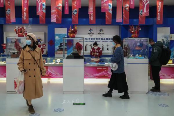 ↑1月13日,北京王府井工美大厦,消费者在选购北京冬奥会特许商品。日前,北京冬奥会特许商品年货节开幕,将持续到2月底。