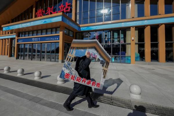 ↑1月6日,河北省张家口市崇礼站正式投入运营。高铁站的一名工作人员正在搬运一块印有“崇礼站开通有我”的广告板。