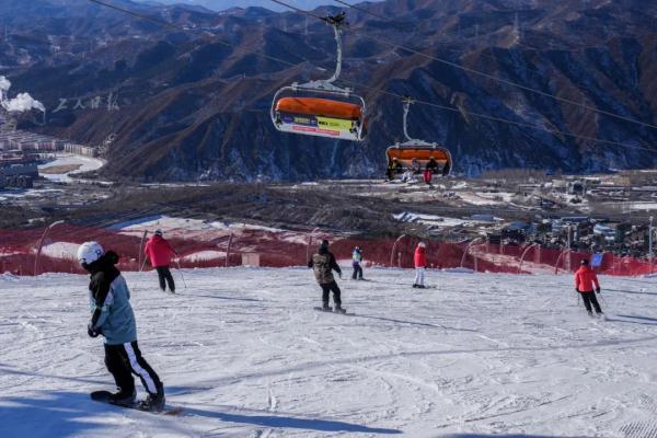 ↑2021年12月25日,河北省张家口市崇礼区,银河滑雪场内滑雪爱好者正在雪道上滑行,享受冰雪运动的乐趣。