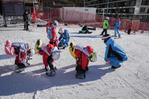 ↑2021年12月22日,河北省张家口市崇礼区云顶滑雪场初级道上,教练员正在帮助孩子们学习单板滑雪。北京2022年冬奥会期间,云顶滑雪公园将承办多项冬奥赛事。