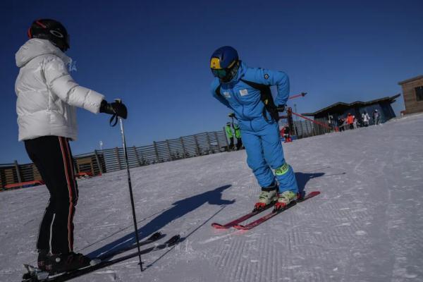 ↑2021年12月24日,河北省张家口市崇礼区,滑雪教练刚玉仓正在教学员滑雪。