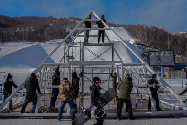 ↑2021年12月23日,河北省张家口市的一处大型滑雪场内,户外施工人员正在搭建钢制构件。