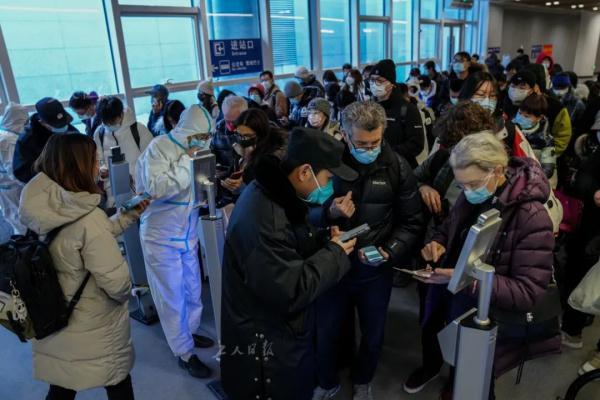 ↑2021年12月24日,河北省张家口市崇礼区太子城站,乘客向工作人员出示核酸检测结果、流调码等信息。为了保证北京2022年冬奥会的顺利举行,崇礼区进一步完善了医疗保障和疫情防控体系。