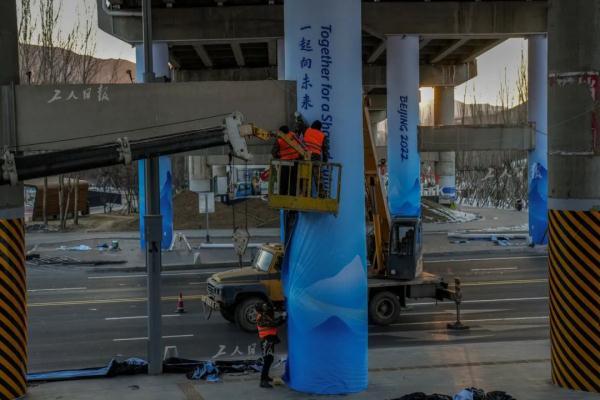 ↑2021年12月22日,河北省张家口市崇礼区,工作人员正在装扮一处高架桥的桥墩。2021年9月17日,北京冬奥会、冬残奥会主题口号正式对外发布——“一起向未来”!
