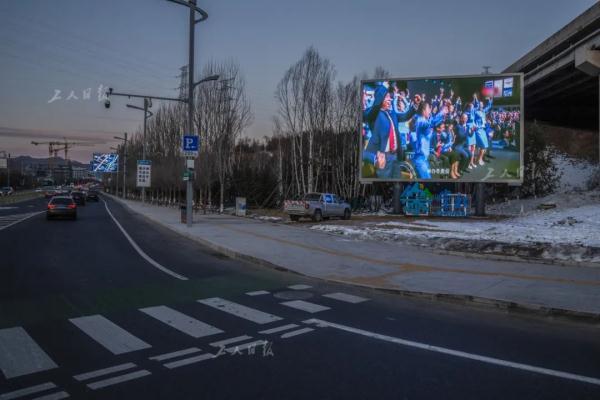 ↑2021年12月22日,河北省张家口市崇礼区,一处电子屏上正播放着2015年北京携手张家口获得2022年冬奥会举办权时的视频画面。随着“带动三亿人参与冰雪运动”目标的提出,冬奥会的申办让更多人因冰雪运动受益。