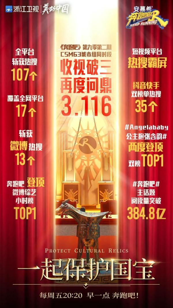 节目播出后,CSM63城收视3.116,再度问鼎周末档省级卫视综艺节目第一,全平台斩获热搜107个,热度居高不下。此外,节目对文物保护话题的呈现更是引发广泛讨论,延续了八年的国民级IP与传统文化话题的结合使其在当下焕发了新活力,引得网友直呼:“跑男这期主题,又好玩又有意义,爱了爱了。”