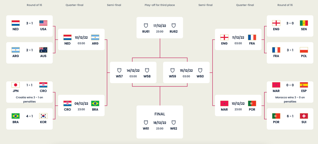考虑到阿根廷和摩洛哥的情况,两支球队想要在各自半区突出重围难度颇大。前者需要连克荷兰以及巴西和克罗地亚之间的胜者,才能晋级决赛,而摩洛哥则需要先过葡萄牙这一关。