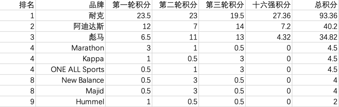 体育大生意统计了每位世界杯登场球员所穿球鞋的品牌,根据球员的表现计分,所得分数记在该品牌名下。把所有该品牌名下球员的积分相加,即为该品牌的总得分。按照总得分排名,得出球鞋榜榜单。