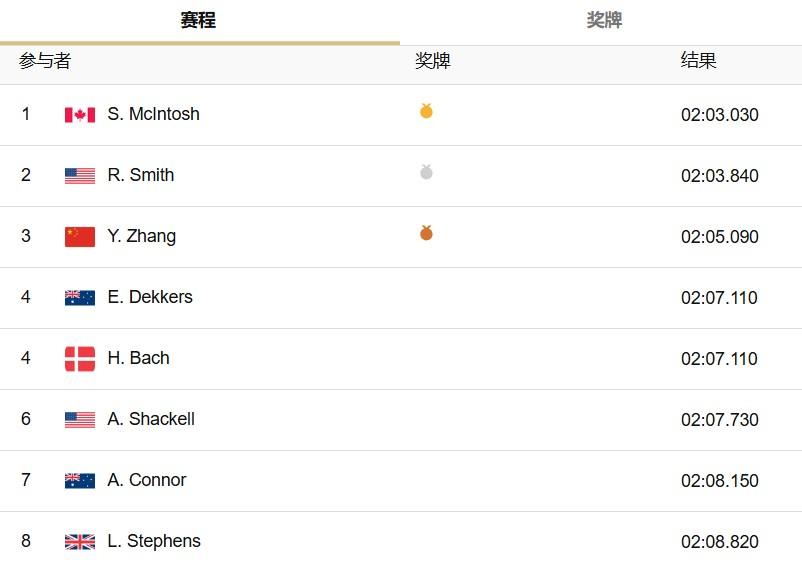 张雨霏出发后占据了第一的位置,第一个50米成绩27秒08,第二个50米结束仍暂列第一,成绩58秒81。进入后100米,张雨霏逐渐被麦金托什超越,最终位列第三名,为中国奥运代表团获得一枚宝贵的铜牌!成绩为2分05秒09。